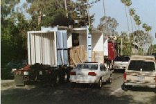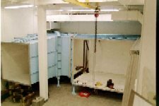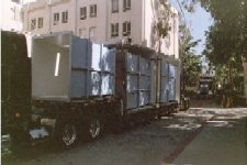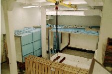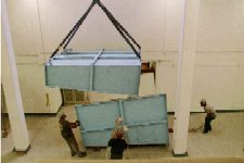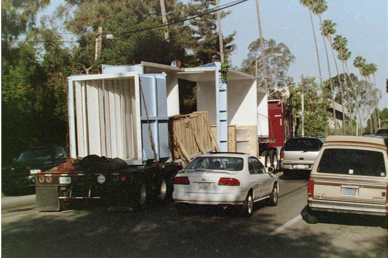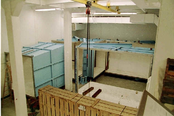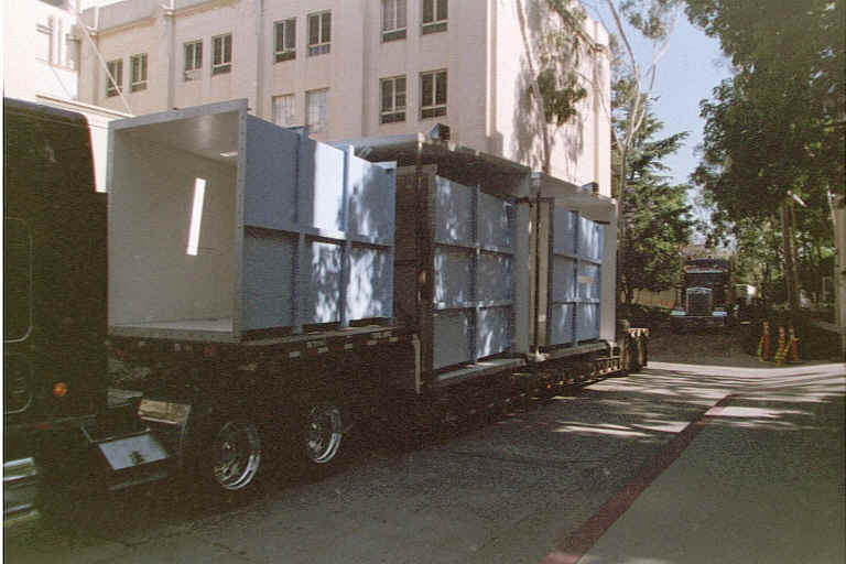 Lucas AWT Construction First Shipment of Parts The first shipment of parts from Aerolab arrived at GALCIT on 6 June 2000, accompanied by Aerolab's Stuart Rodes. Stuart would be working on the wind tunnel assembly for the next several weeks, assisted by the Lucas AWT staff (Gerald Landry and Chris Krok) and the riggers of Mammoet Western's South El Monte office. Mammoet was also contracted to unload the tunnel sections from the trailers, and move and lower them into the wind tunnel room. Stuart had spent much time laboring over AutoCad drawings of the tunnel room layout and access, so the tunnel sections could be made as large as possible and still fit through our access door. This wasn't the most difficult installation Aerolab had ever done, but it certainly wasn't the easiest. After they were unloaded from the trucks, the parts had to be brought up the inclined ramp and the back of Guggenheim. They then had to be brought through a 16'x16' access door, and lowered through a hole in the floor immediately on the other side of the door. This took a combination of forklifts and a small crane inside the building, but went reasonably well. Click on images to enlarge.