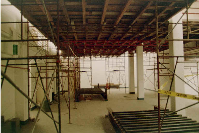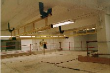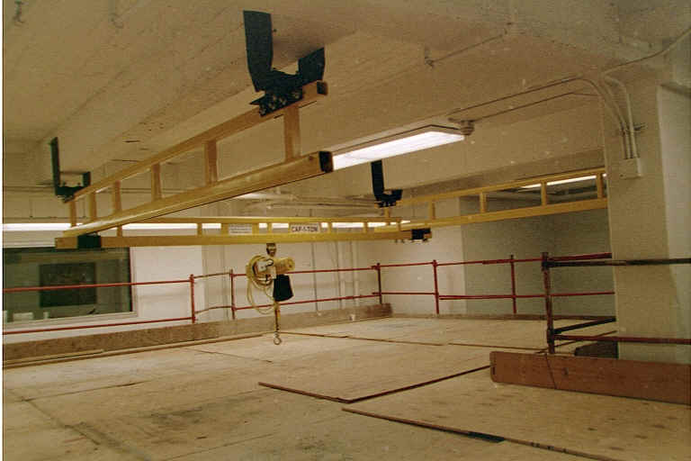 Lucas AWT Construction Tunnel Room Preparation The room used for the Lucas AWT is roughly 90' long, 30' wide and two stories high, located on the basement and sub-basement levels of the Guggenheim building. This part of the building formerly housed the lower leg of the Ten-Foot Tunnel, including the fan section and the motor-generator set. During the Guggenheim renovation, this room was taken down to a dirt floor, which was re-graded and covered with 6" of concrete For later assembly and operation of the tunnel, two overhead crane systems were installed. A two-axis, one-ton gantry crane was installed over the test section side of the room, and a simple I-beam for a trolley and chain hoist were installed over the axis of the settling chamber and flow control stack. The gantry crane can also support a 2-ton chain hoist at each end of the bridge truss. Installation of the cranes on the two-story-high ceiling required that a scaffold be built that covered most of the floor area in the room. Click on images to enlarge.